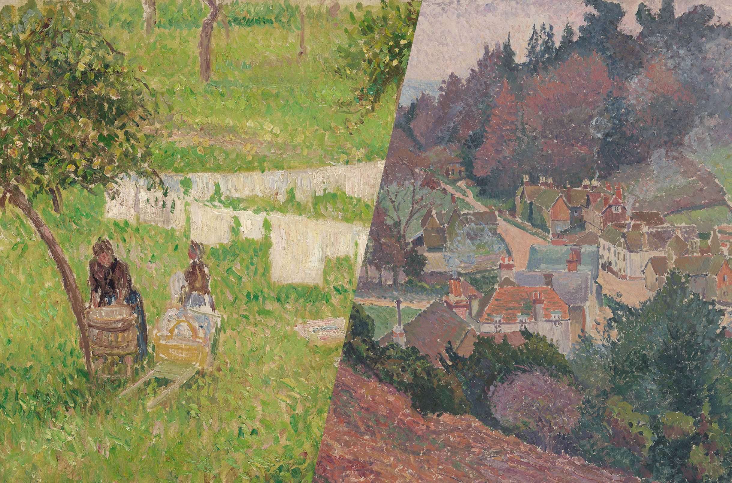 (l-r) Camille Pissarro, La lessive à Éragny (Washing day at Éragny) 1901 / Lucien Pissarro, Tea time, Coldharbour 1916 / View full image